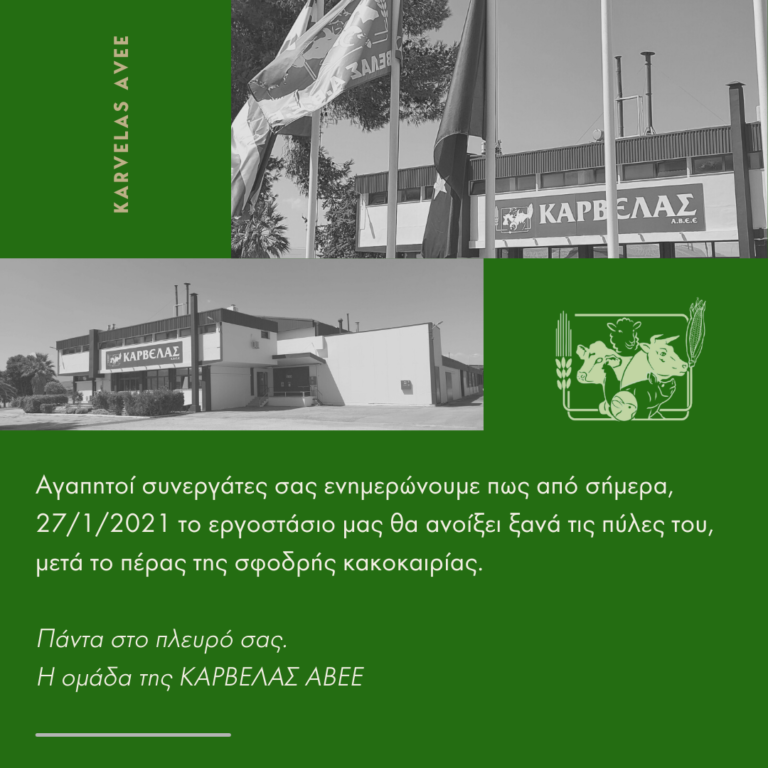 Αγαπητοί συνεργάτες σας ενημερώνουμε πως από σήμερα, 27/1/2021 το εργοστάσιο μας θα ανοίξει ξανά τις πύλες του, μετά το πέρας της σφοδρής κακοκαιρίας.Πάντα στο πλευρό σας.Η ομάδα της ΚΑΡΒΕΛΑΣ ΑΒΕΕ